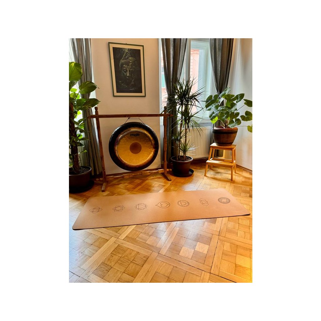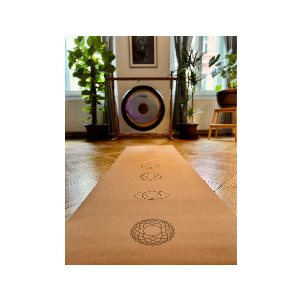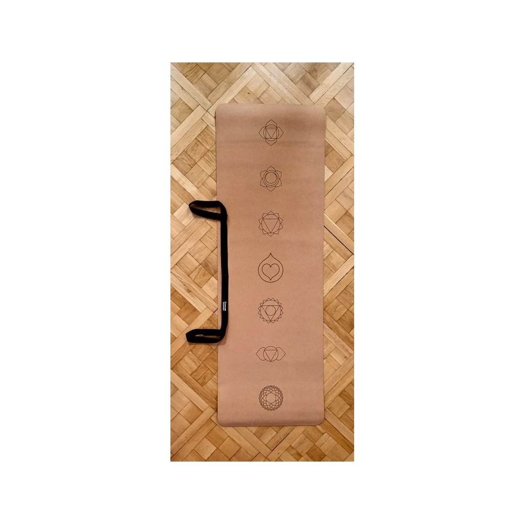 Na povrchu podložky najdete symboly sedmi čaker. Uprostřed, v místě srdeční čakry, je záměrně vyobrazeno logo Kapky naděje. Podložka je z přírodního korku – příjemně pruží, neklouže a drží stabilitu i při dynamičtější praxi.
